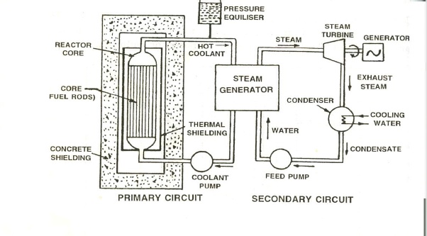 pressurised water nuclear plant is shown in fig. It uses enricheduranium as fuel. Water is used as coolant and moderator. Water passesthrough the reactor core and takes up the heat liberated due to nuclearfission of the fuel. In order that water may not boil (due to its low boilingpoint 2120